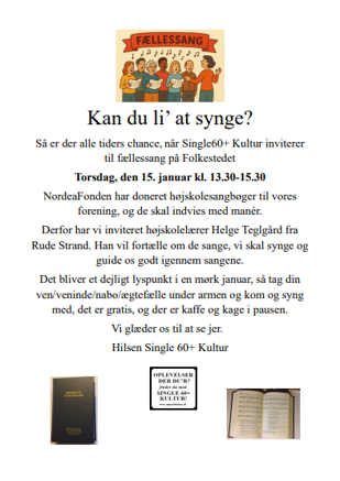 Kan du li’ at synge – eller bare at være med i et fællesskab? Så har du nu en skøn mulighed, når Single 60+ Kultur inviterer til fællessang på Folkestedet.