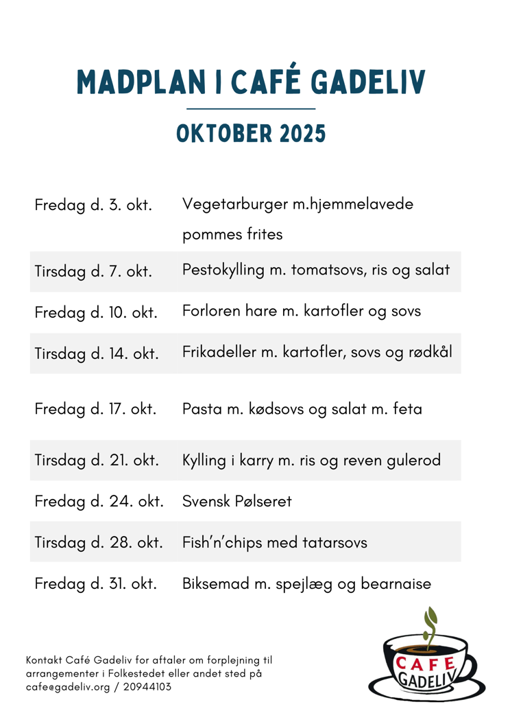 Se, hvilke varme retter caféen byder på hver tirsdag og fredag i denne måned.